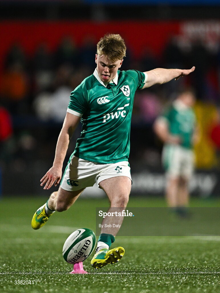 7 March 2026; Charlie O’Shea of Ireland kicks a conversion during the U20 Six Nations Rugby Championship match between Ireland and Wales at Virgin Media Park in Cork. Photo by Seb Daly/Sportsfile