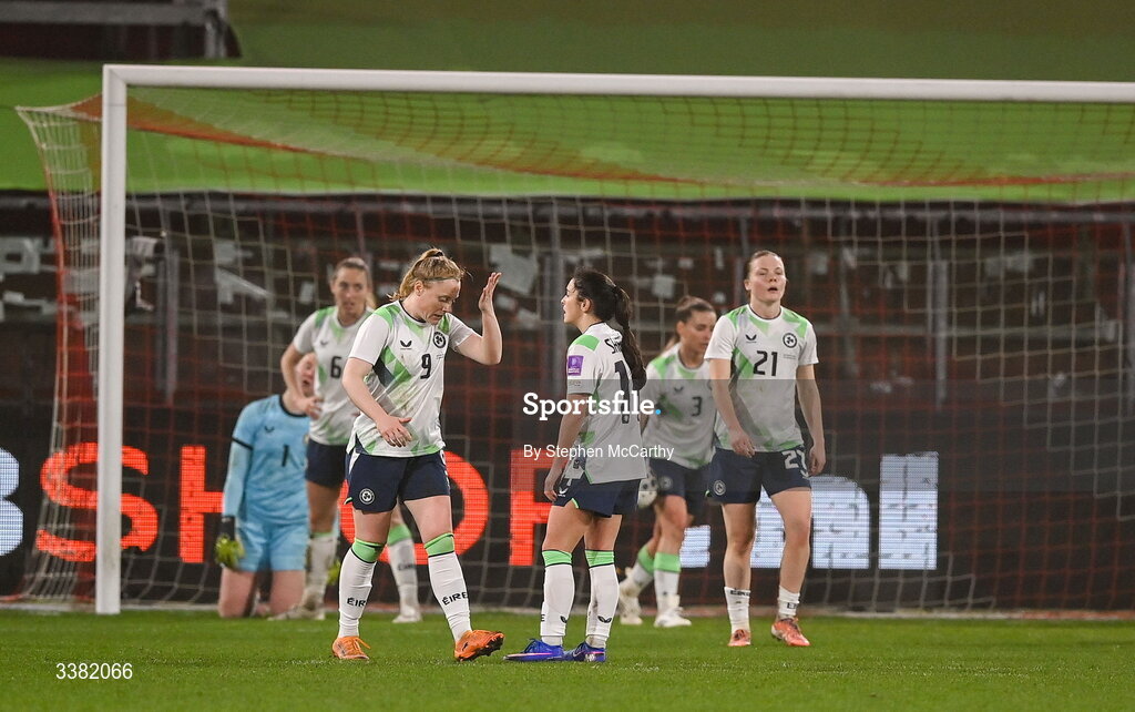 7 March 2026; Republic of Ireland players, including, Amber Barrett, left, and Emily Murphy react after their side concede a second goal during the 2027 FIFA Women’s World Cup Qualifier match between the Netherlands and Republic of Ireland at Stadion Galgenwaard in Utrecht, Netherlands. Photo by Stephen McCarthy/Sportsfile