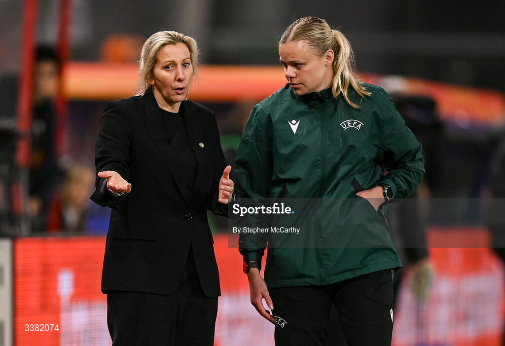 7 March 2026; Republic of Ireland head coach Carla Ward and Fourth official Julie Thomse during the 2027 FIFA Women’s World Cup Qualifier match between the Netherlands and Republic of Ireland at Stadion Galgenwaard in Utrecht, Netherlands. Photo by Stephen McCarthy/Sportsfile