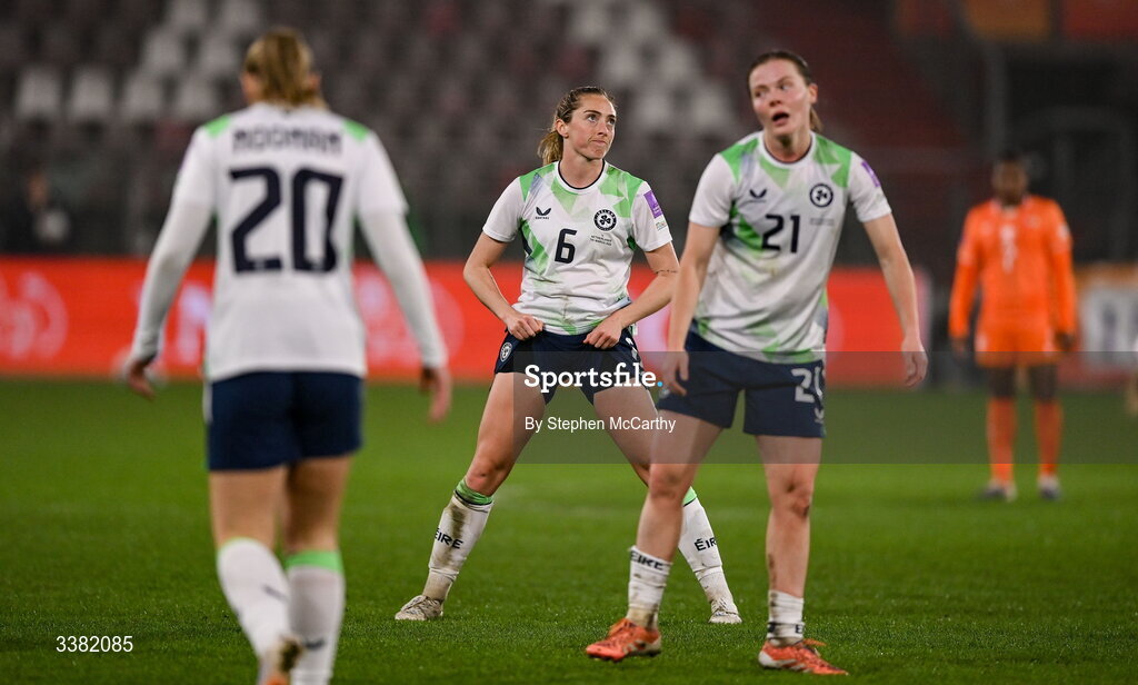 7 March 2026; Megan Connolly, centre, and Emily Murphy of Republic of Ireland during the 2027 FIFA Women’s World Cup Qualifier match between the Netherlands and Republic of Ireland at Stadion Galgenwaard in Utrecht, Netherlands. Photo by Stephen McCarthy/Sportsfile