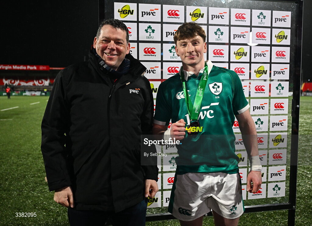 7 March 2026; Player of the Match Daniel Ryan is presented with his medal by Declan Maunsell of PwC after the U20 Six Nations Rugby Championship match between Ireland and Wales at Virgin Media Park in Cork. Photo by Seb Daly/Sportsfile