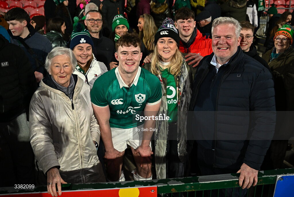 7 March 2026; James O'Leary of Ireland with family after the U20 Six Nations Rugby Championship match between Ireland and Wales at Virgin Media Park in Cork. Photo by Seb Daly/Sportsfile