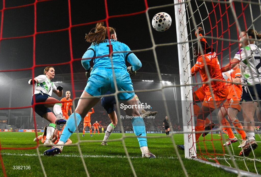 7 March 2026; Lineth Beerensteyn of Netherlands, right, shoots to score her side's second goal during the 2027 FIFA Women’s World Cup Qualifier match between the Netherlands and Republic of Ireland at Stadion Galgenwaard in Utrecht, Netherlands. Photo by Stephen McCarthy/Sportsfile