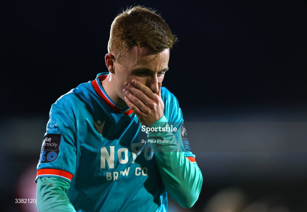 7 March 2026; Brendon Kavanagh of Drogheda United reacts at full-time after the SSE Airtricity Men's Premier Division match between Sligo Rovers and Drogheda United at The Showgrounds in Sligo. Photo by Paul Phelan/Sportsfile