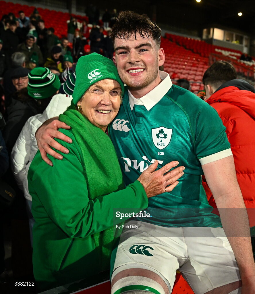 7 March 2026; Donnacha McGuire with his grandmother Mary McGuire after the U20 Six Nations Rugby Championship match between Ireland and Wales at Virgin Media Park in Cork. Photo by Seb Daly/Sportsfile