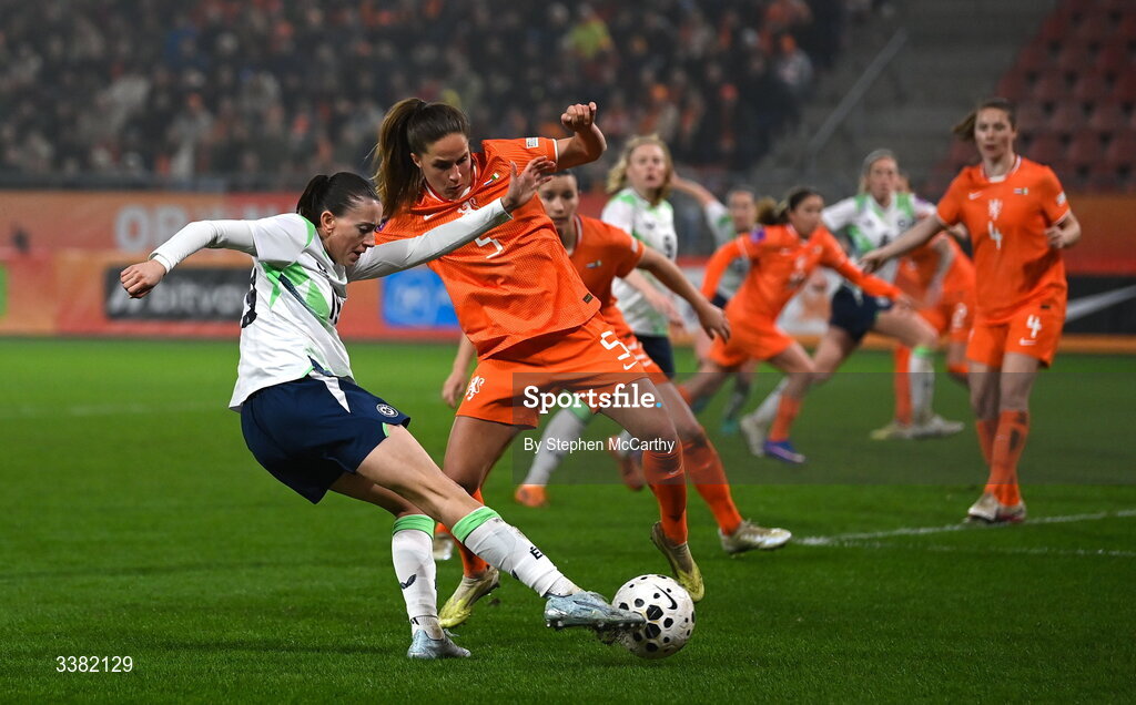 7 March 2026; Abbie Larkin of Republic of Ireland in action against Marisa Olislagers of Netherlands during the 2027 FIFA Women’s World Cup Qualifier match between the Netherlands and Republic of Ireland at Stadion Galgenwaard in Utrecht, Netherlands. Photo by Stephen McCarthy/Sportsfile
