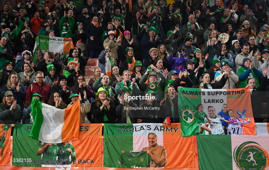 7 March 2026; Republic of Ireland supporters after the 2027 FIFA Women’s World Cup Qualifier match between the Netherlands and Republic of Ireland at Stadion Galgenwaard in Utrecht, Netherlands. Photo by Stephen McCarthy/Sportsfile