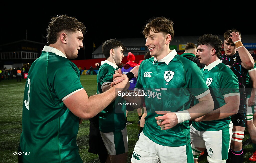 7 March 2026; Ireland players Daniel Ryan, right, and Sami Bishti after their side's victory in the U20 Six Nations Rugby Championship match between Ireland and Wales at Virgin Media Park in Cork. Photo by Seb Daly/Sportsfile