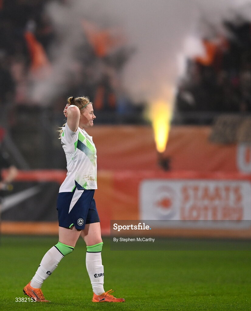 7 March 2026; Amber Barrett of Republic of Ireland reacts after the 2027 FIFA Women’s World Cup Qualifier match between the Netherlands and Republic of Ireland at Stadion Galgenwaard in Utrecht, Netherlands. Photo by Stephen McCarthy/Sportsfile
