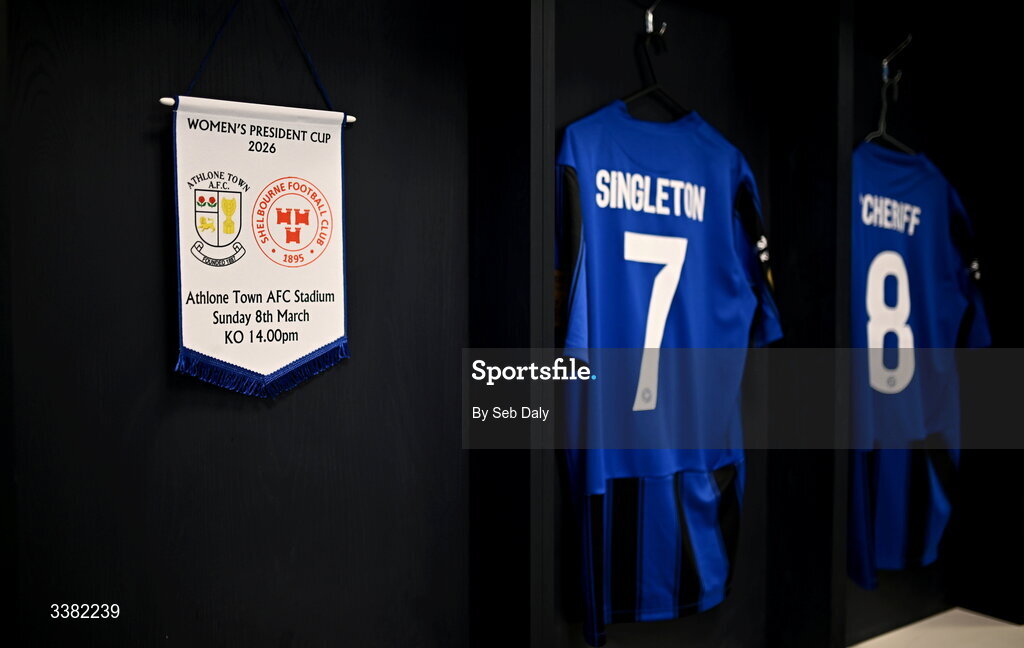 8 March 2026; A match pennant hangs in the Athlone Town dressing room before the 2026 Women's President's Cup final match between Athlone Town and Shelbourne at Athlone Town Stadium in Westmeath. Photo by Seb Daly/Sportsfile