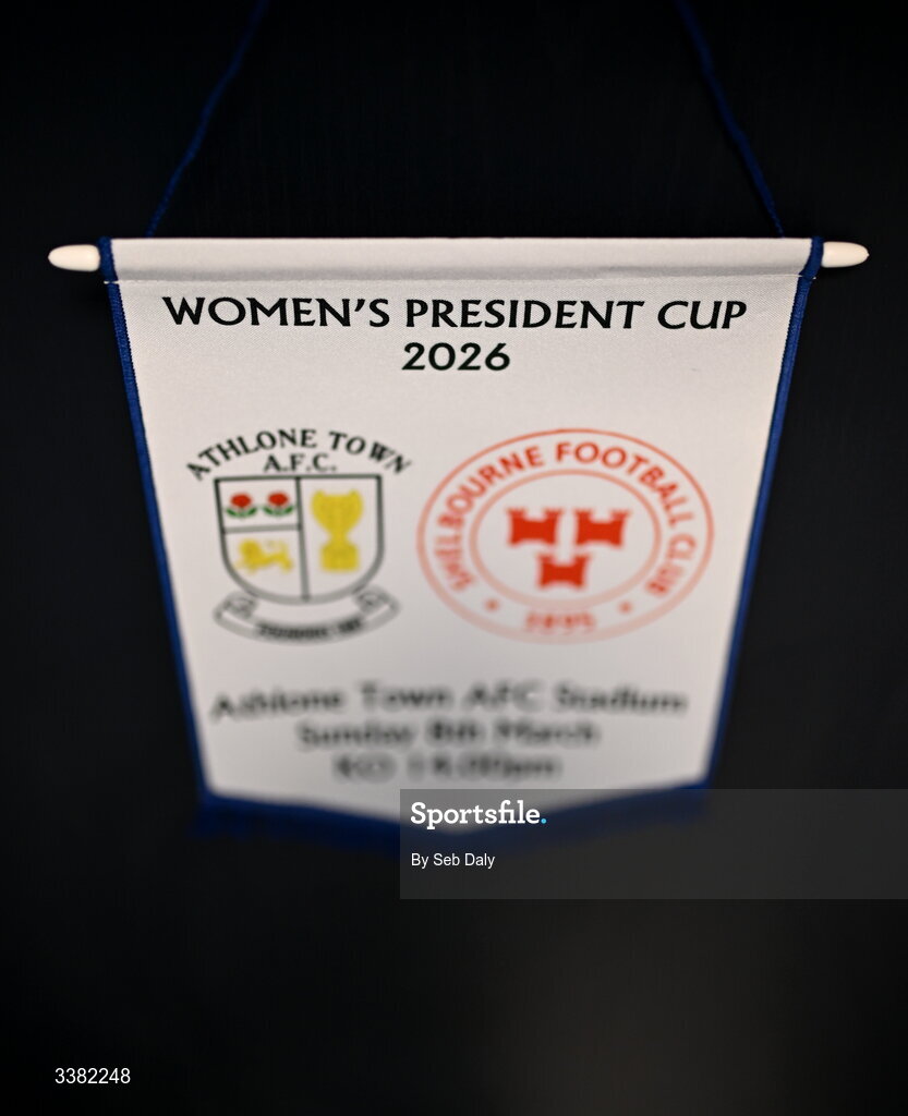 8 March 2026; A match pennant hangs in the Athlone Town dressing room before the 2026 Women's President's Cup final match between Athlone Town and Shelbourne at Athlone Town Stadium in Westmeath. Photo by Seb Daly/Sportsfile