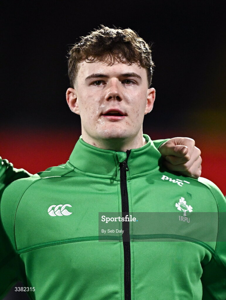 7 March 2026; James O'Leary of Ireland before the U20 Six Nations Rugby Championship match between Ireland and Wales at Virgin Media Park in Cork. Photo by Seb Daly/Sportsfile
