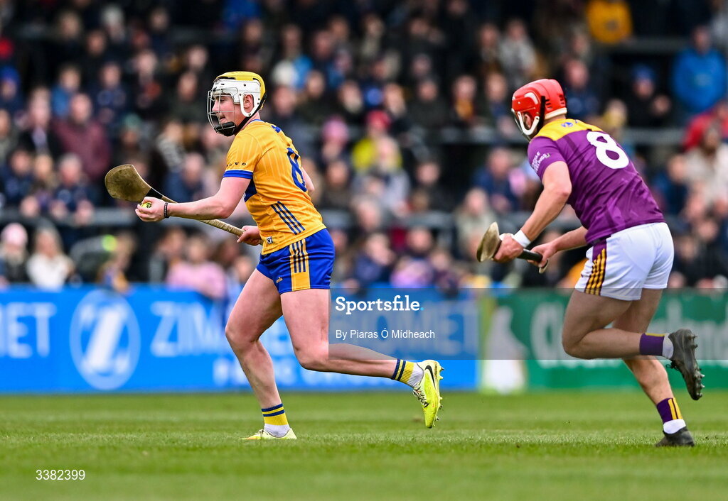8 March 2026; Seán Rynne of Clare in action against Conor Hearne of Wexford during the Allianz Hurling League Division 1B match between Clare and Wexford at Zimmer Biomet Páirc Chíosóg in Ennis, Clare. Photo by Piaras Ó Mídheach/Sportsfile
