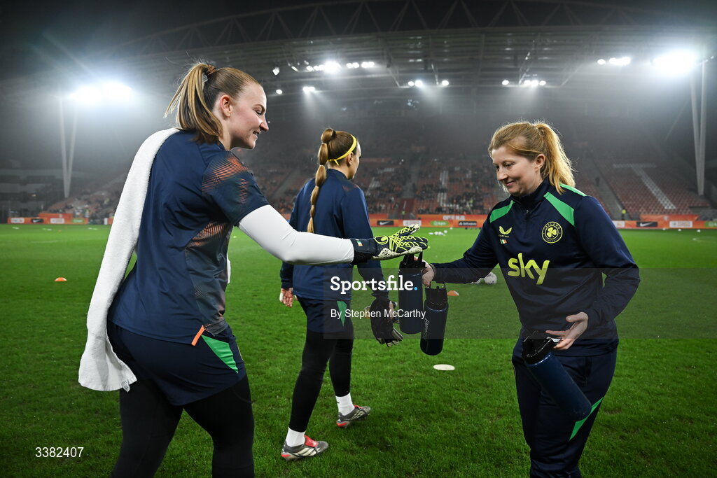 7 March 2026; Republic of Ireland performance coach Holly Pickett with goalkeeper Courtney Brosnan before the 2027 FIFA Women’s World Cup Qualifier match between the Netherlands and Republic of Ireland at Stadion Galgenwaard in Utrecht, Netherlands. Photo by Stephen McCarthy/Sportsfile