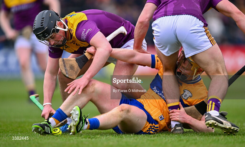 8 March 2026; Shane Meehan of Clare in action against Darragh Carley, left, and Richie Lawlor of Wexford during the Allianz Hurling League Division 1B match between Clare and Wexford at Zimmer Biomet Páirc Chíosóg in Ennis, Clare. Photo by Piaras Ó Mídheach/Sportsfile