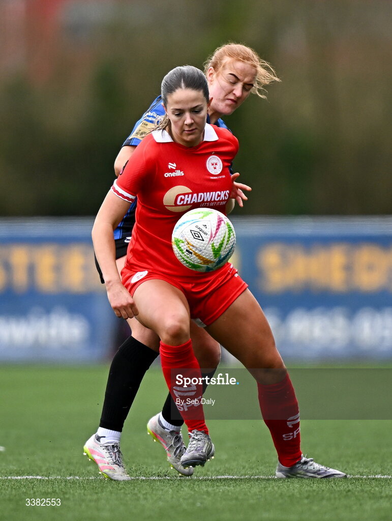 8 March 2026; Becky Watkins of Shelbourne in action against Shauna Brennan of Athlone Town during the 2026 Women's President's Cup final match between Athlone Town and Shelbourne at Athlone Town Stadium in Westmeath. Photo by Seb Daly/Sportsfile