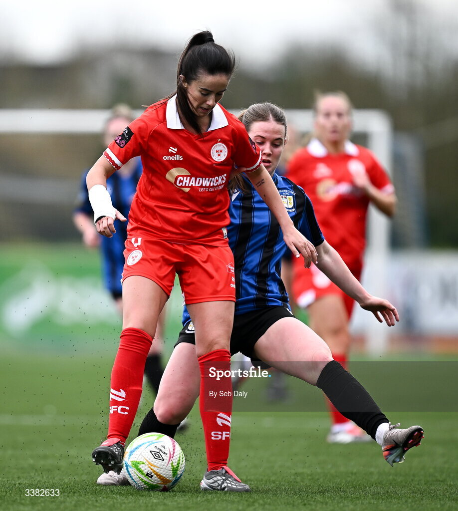 8 March 2026; Alex Kavanagh of Shelbourne in action against Emma Mooney of Athlone Town during the 2026 Women's President's Cup final match between Athlone Town and Shelbourne at Athlone Town Stadium in Westmeath. Photo by Seb Daly/Sportsfile