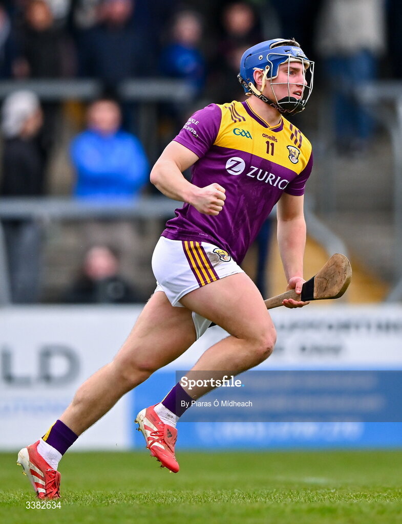 8 March 2026; Simon Roche of Wexford celebrates scoring his side's first goal during the Allianz Hurling League Division 1B match between Clare and Wexford at Zimmer Biomet Páirc Chíosóg in Ennis, Clare. Photo by Piaras Ó Mídheach/Sportsfile