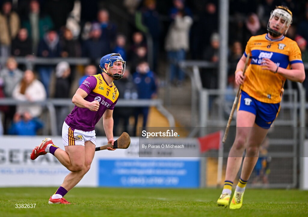 8 March 2026; Simon Roche of Wexford celebrates scoring his side's first goal during the Allianz Hurling League Division 1B match between Clare and Wexford at Zimmer Biomet Páirc Chíosóg in Ennis, Clare. Photo by Piaras Ó Mídheach/Sportsfile