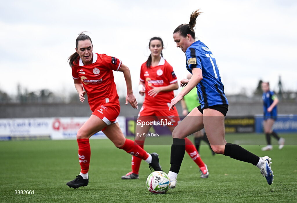 8 March 2026; Madie Gibson of Athlone Town in action against Jess Gargan of Shelbourne during the 2026 Women's President's Cup final match between Athlone Town and Shelbourne at Athlone Town Stadium in Westmeath. Photo by Seb Daly/Sportsfile