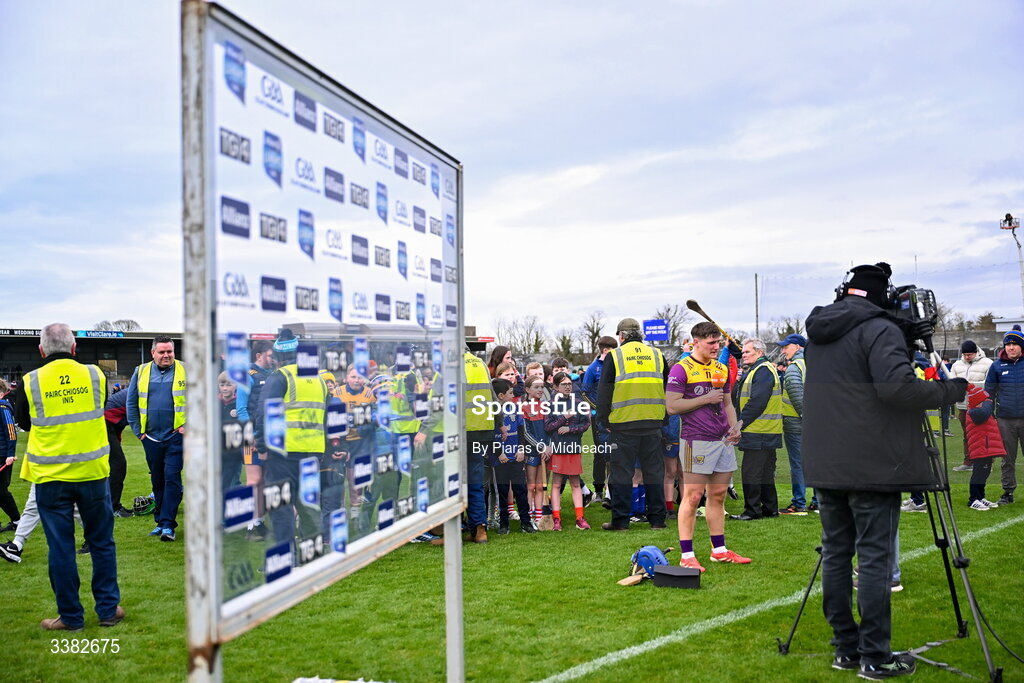 8 March 2026; Man of the Match Simon Roche is interviewed away from an Allianz sponsorship board after the Allianz Hurling League Division 1B match between Clare and Wexford at Zimmer Biomet Páirc Chíosóg in Ennis, Clare. Photo by Piaras Ó Mídheach/Sportsfile