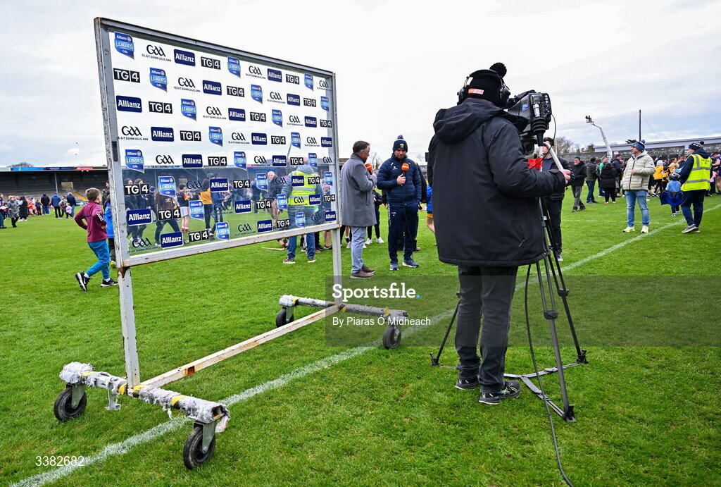8 March 2026; Micheál Ó Domhnaill of TG4 interviews Wexford manager Keith Rossiter, away from the Allianz sponsorship board, after the Allianz Hurling League Division 1B match between Clare and Wexford at Zimmer Biomet Páirc Chíosóg in Ennis, Clare. Photo by Piaras Ó Mídheach/Sportsfile