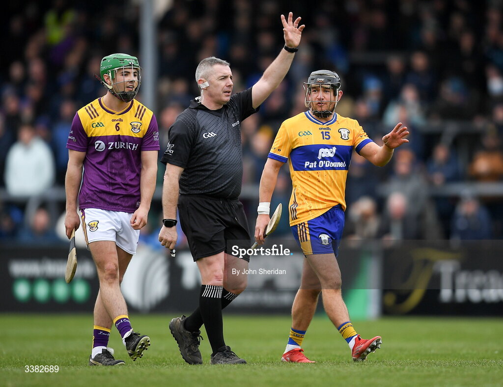 8 March 2026; David Reidy of Clare in discussion with referee Liam Gordon during the Allianz Hurling League Division 1B match between Clare and Wexford at Zimmer Biomet Páirc Chíosóg in Ennis, Clare. Photo by John Sheridan/Sportsfile