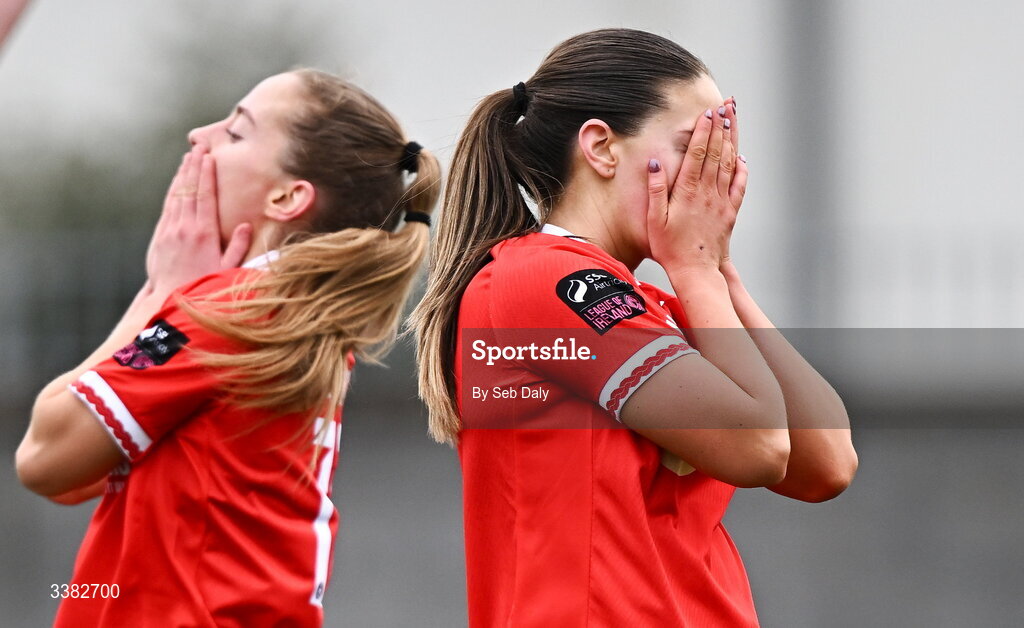 8 March 2026; Becky Watkins of Shelbourne, right, reacts during the 2026 Women's President's Cup final match between Athlone Town and Shelbourne at Athlone Town Stadium in Westmeath. Photo by Seb Daly/Sportsfile