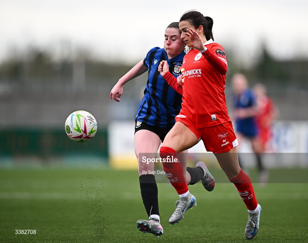 8 March 2026; Olivia Damico of Shelbourne in action against Kellie Brennan of Athlone Town during the 2026 Women's President's Cup final match between Athlone Town and Shelbourne at Athlone Town Stadium in Westmeath. Photo by Seb Daly/Sportsfile