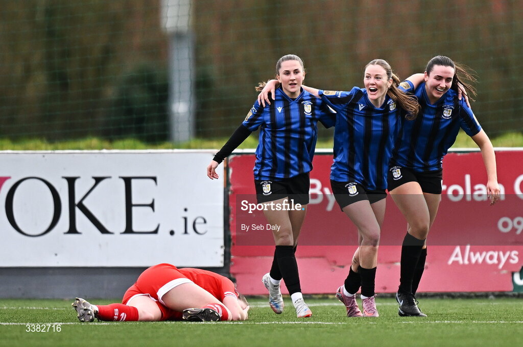 8 March 2026; Dana Scheriff of Athlone Town, centre, celebrates with teammates Isabel Ryan, left, Chloe Singleton of Athlone Town after scoring their side's first goal during the 2026 Women's President's Cup final match between Athlone Town and Shelbourne at Athlone Town Stadium in Westmeath. Photo by Seb Daly/Sportsfile