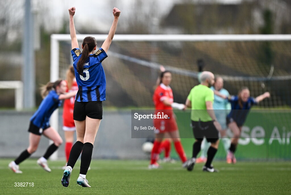 8 March 2026; Kayleigh Shine of Athlone Town celebrates her side's goal first goal, scored by teammate Dana Scheriff, right, during the 2026 Women's President's Cup final match between Athlone Town and Shelbourne at Athlone Town Stadium in Westmeath. Photo by Seb Daly/Sportsfile