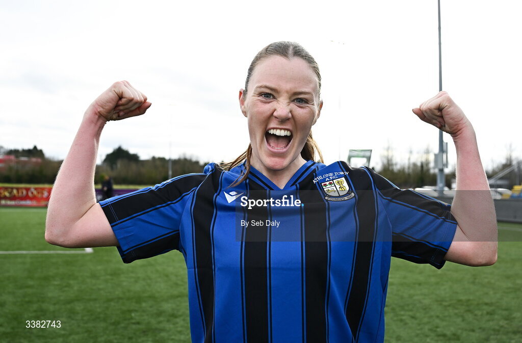 8 March 2026; Dana Scheriff of Athlone Town celebrates after her side's victory in the 2026 Women's President's Cup final match between Athlone Town and Shelbourne at Athlone Town Stadium in Westmeath. Photo by Seb Daly/Sportsfile