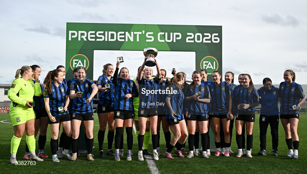 8 March 2026; Athlone Town captain Hannah Waesch lifts the FAI President's Cup alongside her teammates after their side's victory in the 2026 Women's President's Cup final match between Athlone Town and Shelbourne at Athlone Town Stadium in Westmeath. Photo by Seb Daly/Sportsfile