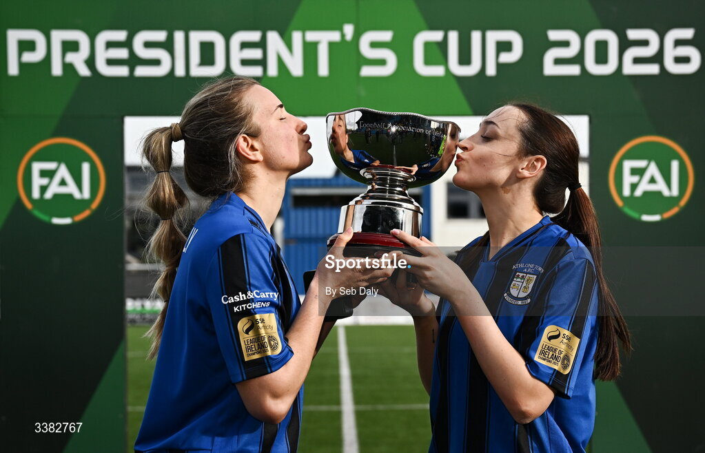8 March 2026; Athlone Town players Natalie McNally, left, and Kayleigh Shine with the FAI President's Cup after their side's victory in the 2026 Women's President's Cup final match between Athlone Town and Shelbourne at Athlone Town Stadium in Westmeath. Photo by Seb Daly/Sportsfile