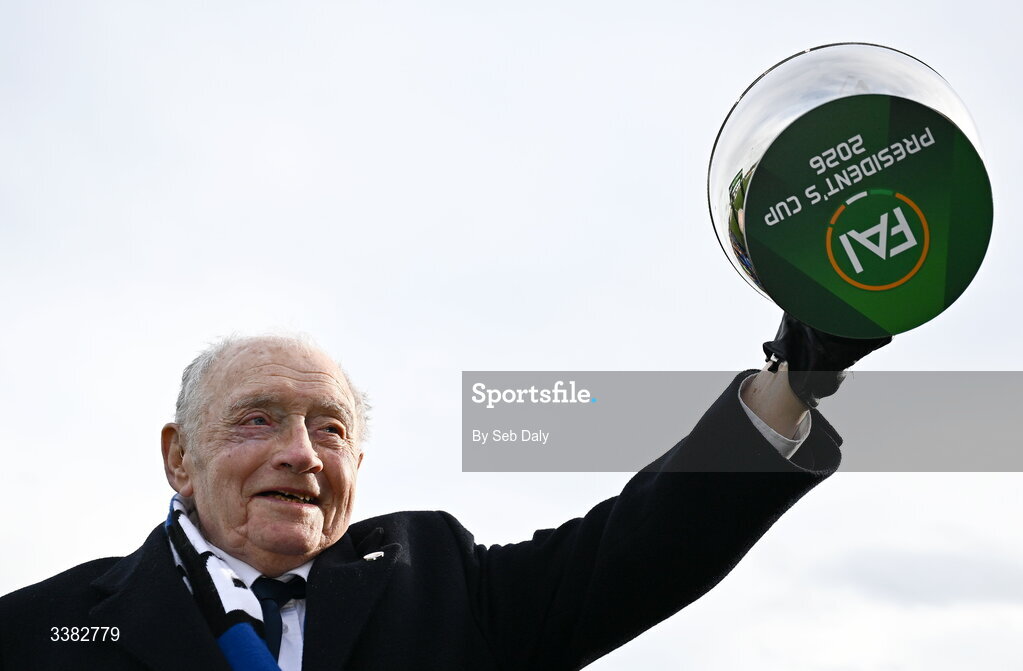 8 March 2026; Athlone Town FC President Liam Gaffey lifts the FAI President's Cup after the 2026 Women's President's Cup final match between Athlone Town and Shelbourne at Athlone Town Stadium in Westmeath. Photo by Seb Daly/Sportsfile