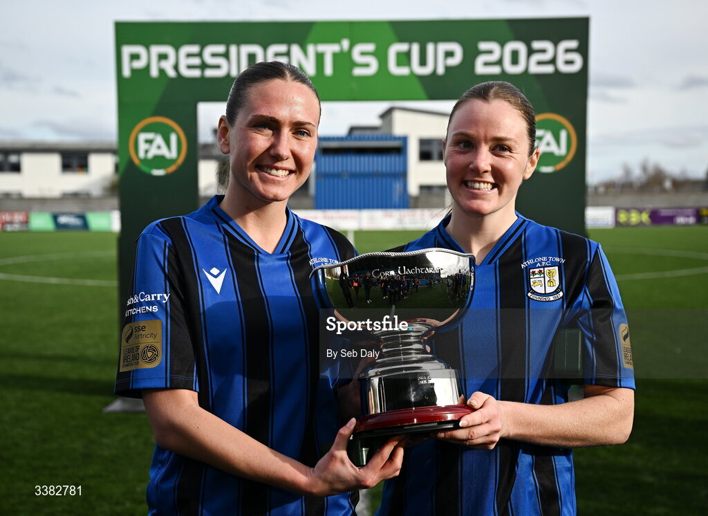 8 March 2026; Athlone Town players Madie Gibson, left, and Dana Scheriff with the FAI President's Cup after the 2026 Women's President's Cup final match between Athlone Town and Shelbourne at Athlone Town Stadium in Westmeath. Photo by Seb Daly/Sportsfile