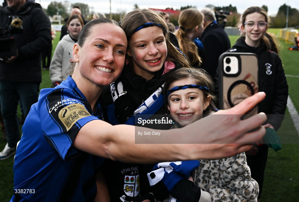 8 March 2026; Madie Gibson of Athlone Town takes a selfie with supporters after the 2026 Women's President's Cup final match between Athlone Town and Shelbourne at Athlone Town Stadium in Westmeath. Photo by Seb Daly/Sportsfile