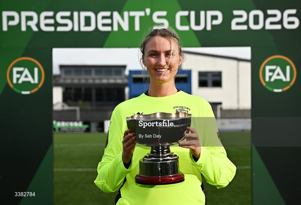 8 March 2026; Athlone Town goalkeeper Courtney Maguire with the FAI President's Cup after the 2026 Women's President's Cup final match between Athlone Town and Shelbourne at Athlone Town Stadium in Westmeath. Photo by Seb Daly/Sportsfile