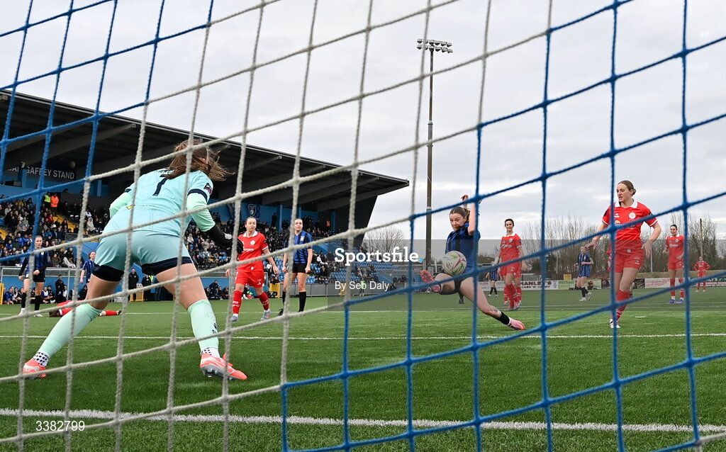 8 March 2026; Dana Scheriff of Athlone Town scores her side's winning goal during the 2026 Women's President's Cup final match between Athlone Town and Shelbourne at Athlone Town Stadium in Westmeath. Photo by Seb Daly/Sportsfile