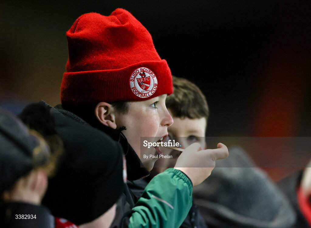 7 March 2026; A Sligo Rovers fan watches during the SSE Airtricity Men's Premier Division match between Sligo Rovers and Drogheda United at The Showgrounds in Sligo. Photo by Paul Phelan/Sportsfile