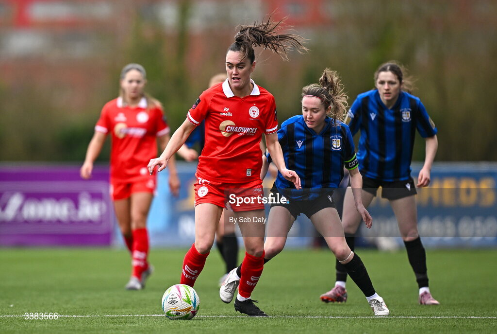 8 March 2026; Jess Gargan of Shelbourne in action against Hannah Waesch of Athlone Town during the 2026 Women's President's Cup final match between Athlone Town and Shelbourne at Athlone Town Stadium in Westmeath. Photo by Seb Daly/Sportsfile