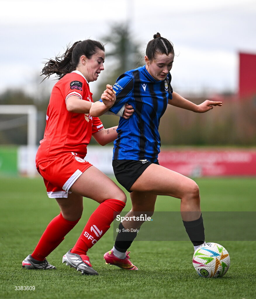 8 March 2026; Melissa O'Kane of Athlone Town in action against Alex Kavanagh of Shelbourne during the 2026 Women's President's Cup final match between Athlone Town and Shelbourne at Athlone Town Stadium in Westmeath. Photo by Seb Daly/Sportsfile