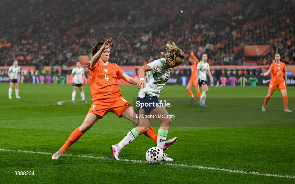 7 March 2026; Kyra Carusa of Republic of Ireland in action against Veerle Buurman of Netherlands during the 2027 FIFA Women’s World Cup Qualifier match between the Netherlands and Republic of Ireland at Stadion Galgenwaard in Utrecht, Netherlands. Photo by Stephen McCarthy/Sportsfile