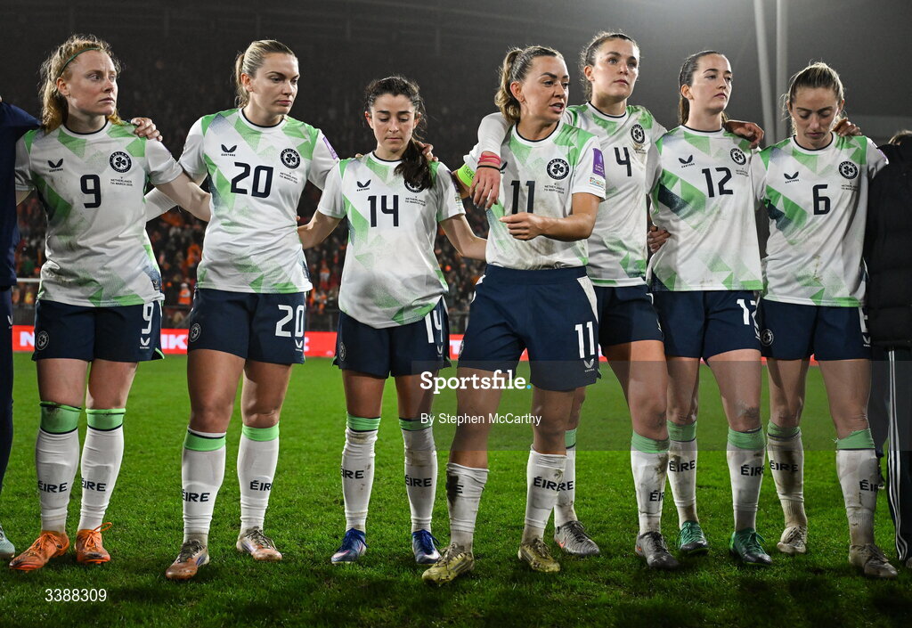 7 March 2026; Republic of Ireland players, from left, Amber Barrett, Saoirse Noonan, Marissa Sheva, Katie McCabe, Caitlin Hayes, Anna Patten and Megan Connolly after the 2027 FIFA Women’s World Cup Qualifier match between the Netherlands and Republic of Ireland at Stadion Galgenwaard in Utrecht, Netherlands. Photo by Stephen McCarthy/Sportsfile