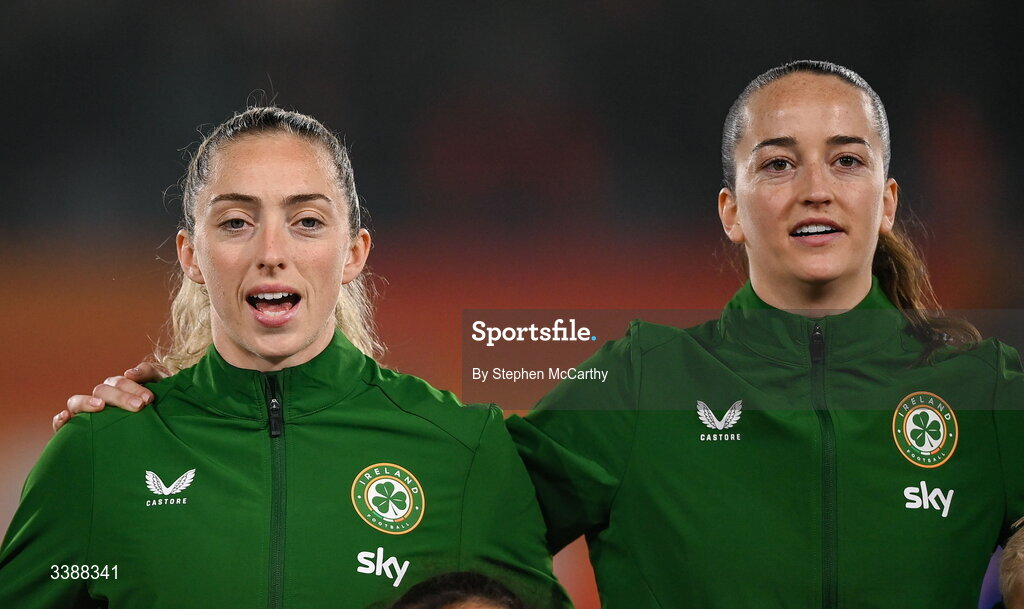 7 March 2026; Megan Connolly, left, and Anna Patten of Republic of Ireland before the 2027 FIFA Women’s World Cup Qualifier match between the Netherlands and Republic of Ireland at Stadion Galgenwaard in Utrecht, Netherlands. Photo by Stephen McCarthy/Sportsfile