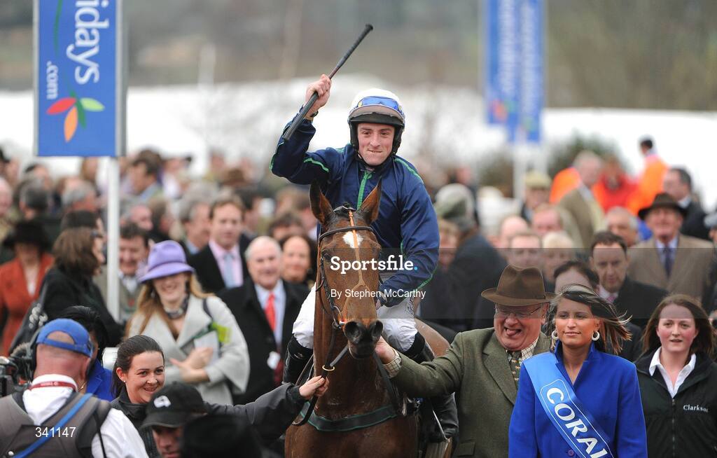 11 March 2009; Jockey Paddy Flood celebrates after winning the Coral Cup on Ninetieth Minute. Cheltenham Racing Festival, Prestbury Park, Cheltenham, Gloucestershire, England. Picture credit: Stephen McCarthy / SPORTSFILE