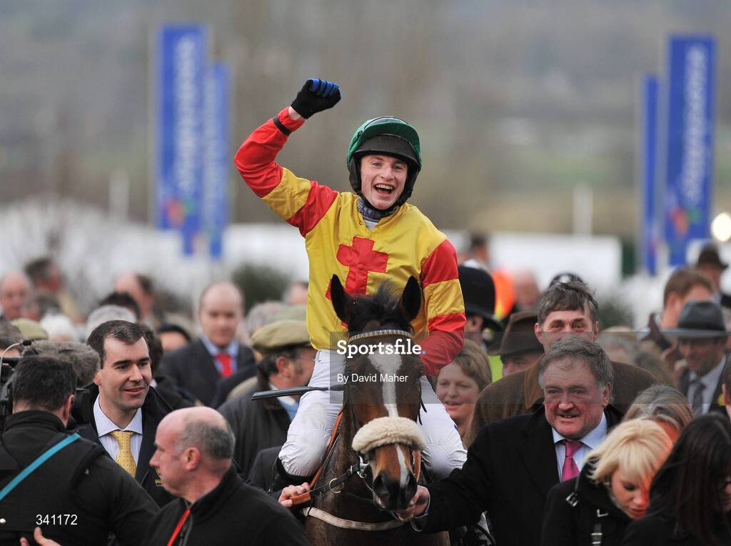 11 March 2009; Jockey Tom O'Brien celebrates after winning the Fred Winter Juvenile Novices' Handicap Hurdle Race on Silk Affair. Cheltenham Racing Festival, Prestbury Park, Cheltenham, Gloucestershire, England. Picture credit: David Maher / SPORTSFILE