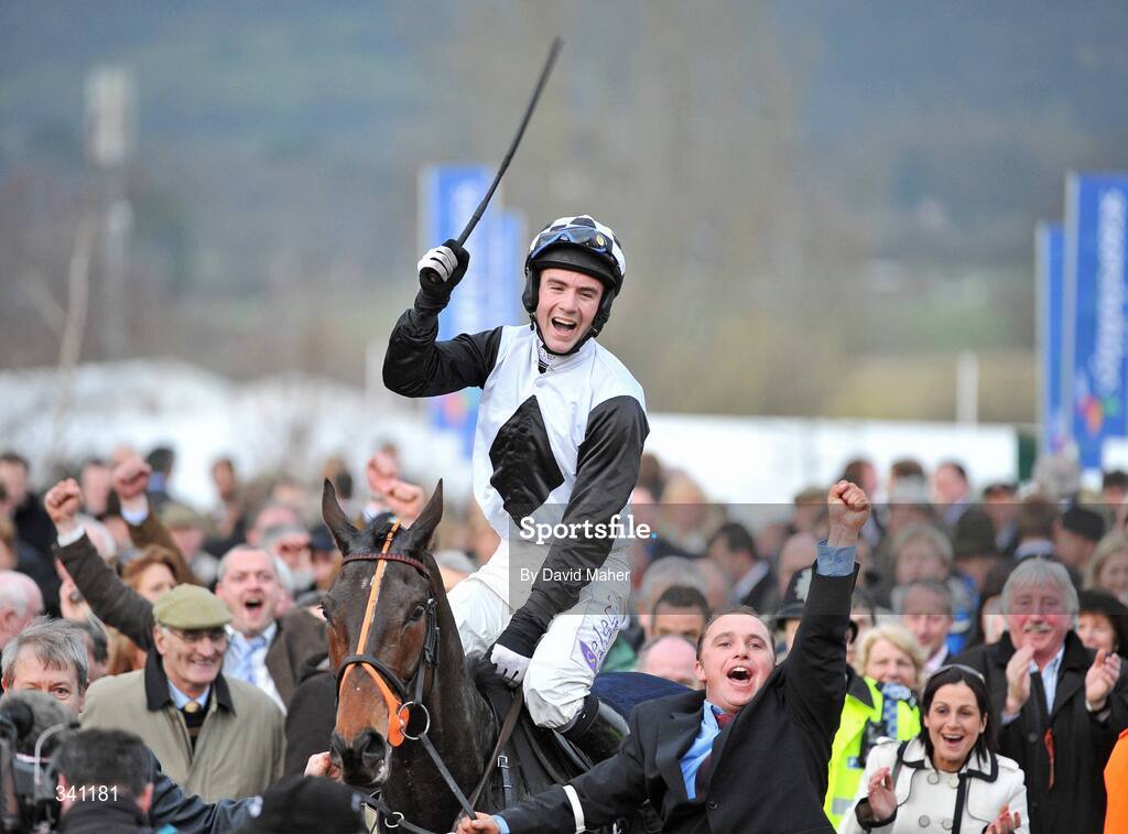 11 March 2009; Jockey Brian O'Connell celebrates after winning the Weatherbys Champion Bumper onboard Dunguib. Cheltenham Racing Festival, Prestbury Park, Cheltenham, Gloucestershire, England. Picture credit: David Maher / SPORTSFILE