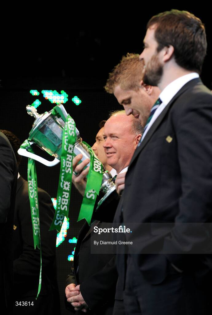 22 March 2009; Ireland head coach Declan Kidney watches on as Jamie Heaslip examines the RBS Six Nations Championship Trophy alongside Marcus Horan on the teams return to Dublin after completing the Grand Slam. Ireland rugby squad homecoming. Dawson Street, Dublin. Picture credit: Diarmuid Greene / SPORTSFILE