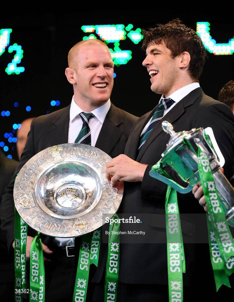 22 March 2009; Ireland's Paul O'Connell, left, and Donncha O'Callaghan with the Triple Crown and the RBS Six Nations Championship Trophy on the team's return to Dublin after completing the Grand Slam. Ireland rugby squad homecoming. Dawson Street, Dublin. Picture credit: Stephen McCarthy / SPORTSFILE